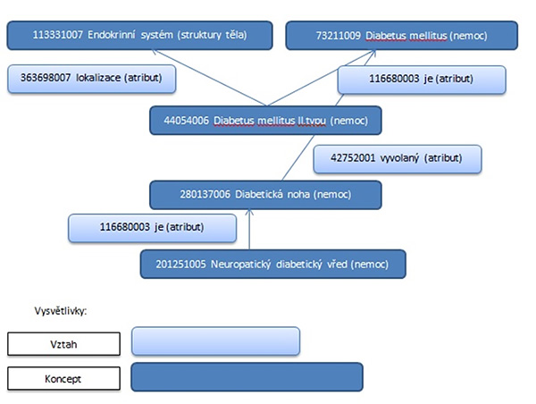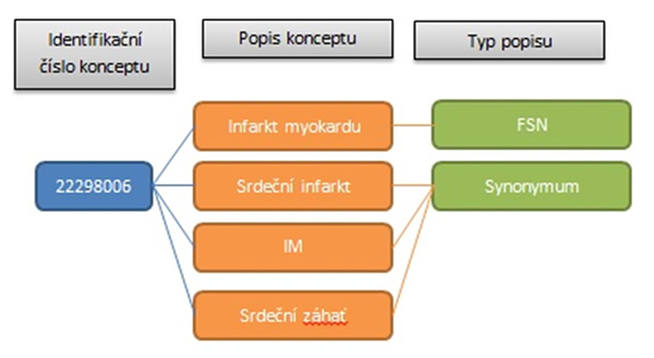 Základním kamenem Snomed CT je takzvaný „koncept“, který reprezentuje klinické konstatování a má své jedinečné identifikační číslo (viz obr. č. 1). V lednu 2019 vydal SI novou verzi mezinárodní edice Snomed CT obsahující 349 548 konceptů. Koncepty jsou navzájem uspořádány v poly-hierarchických „vztazích“. Vztah reprezentuje asociaci mezi dvěma koncepty. Každý koncept může mít dva typy „popisu“: plně specifikované jméno ang. Fully Specified Name - FSN nebo synonymum (viz obr. č. 1) Hierarchie Snomed CT je naznačena na obr. č. 2.